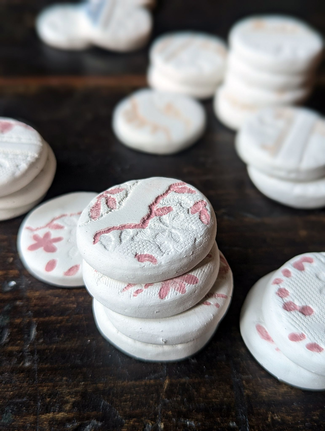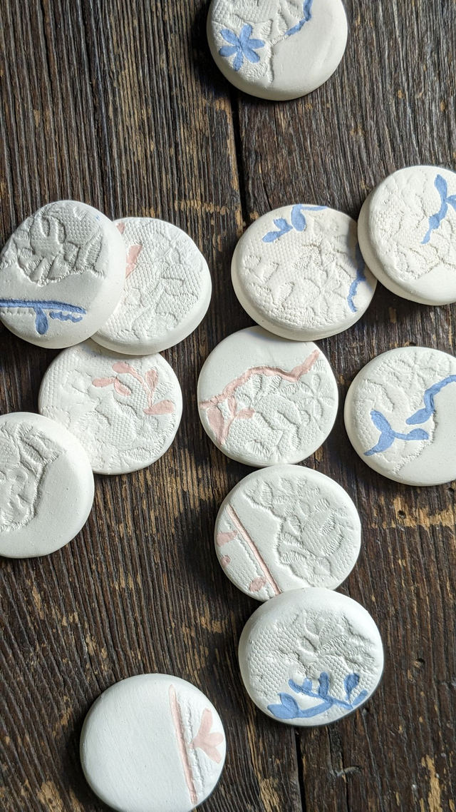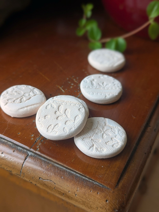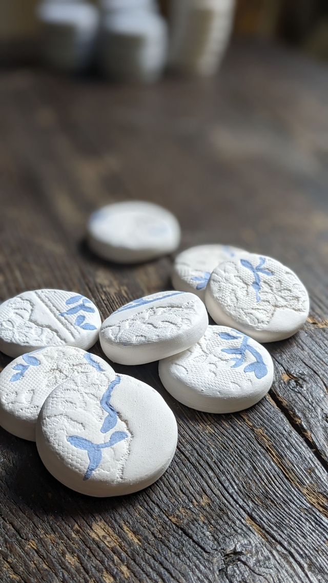 Petits diffuseurs pour parfums ou huiles essentielles : petits disques de faïence poreuse, à placer partout dans la maison (armoires à vêtements, sur un radiateur, salle de bain, poubelle, etc)